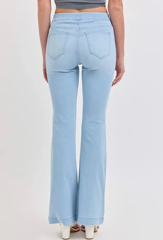 Mid rise 30” petite pull on flare. Faux front pockets and functional back pockets.