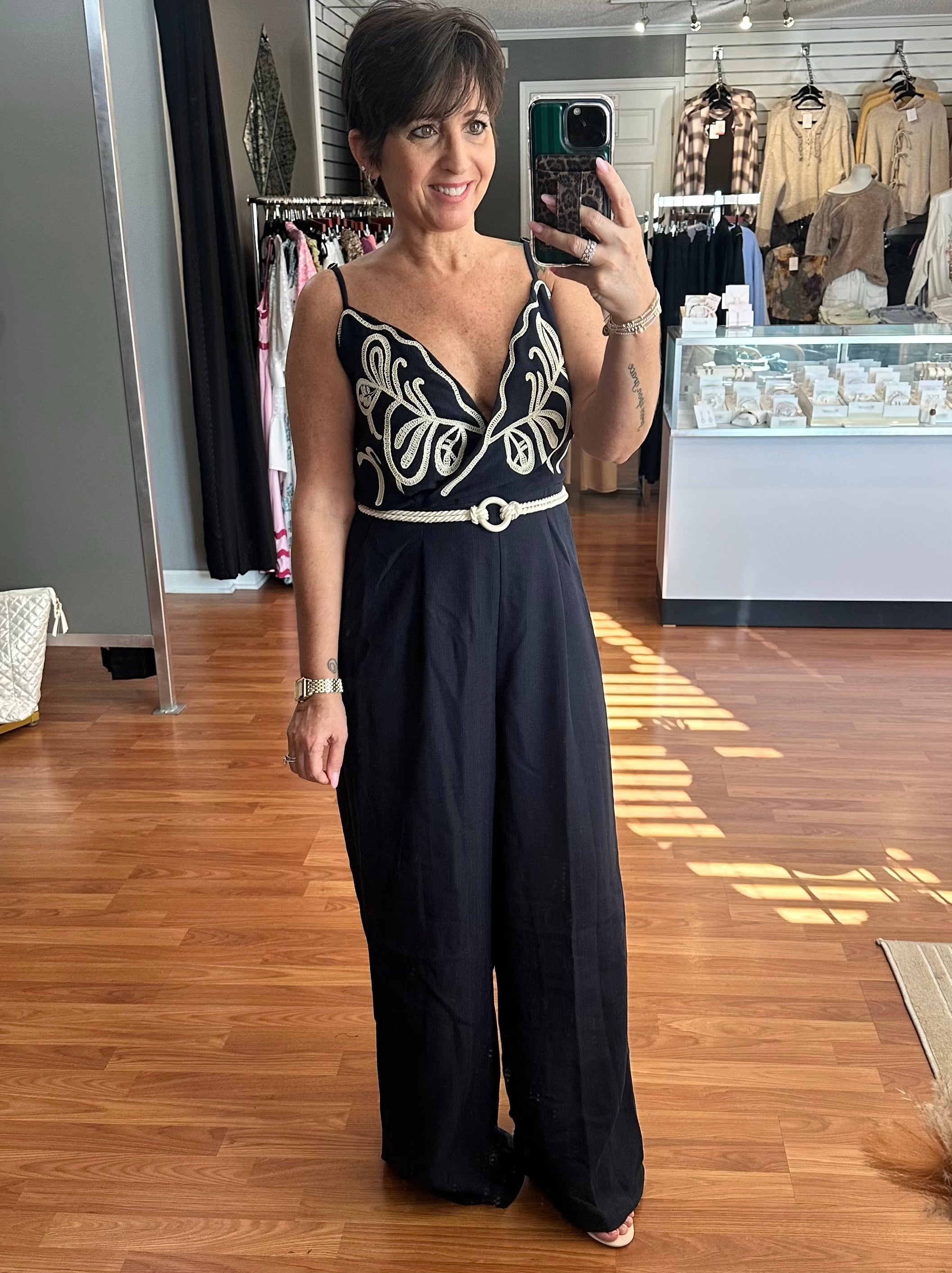 Slip into effortless style with this navy jumpsuit that's anything but basic. The embroidered bodice adds a touch of artisanal charm, while the belted cable rope cinches your silhouette for a flattering fit. Perfect for dressing up a casual day or transitioning seamlessly into evening plans, this one-piece wonder keeps you looking polished without the fuss. A playful staple that proves jumpsuits are always a good idea.