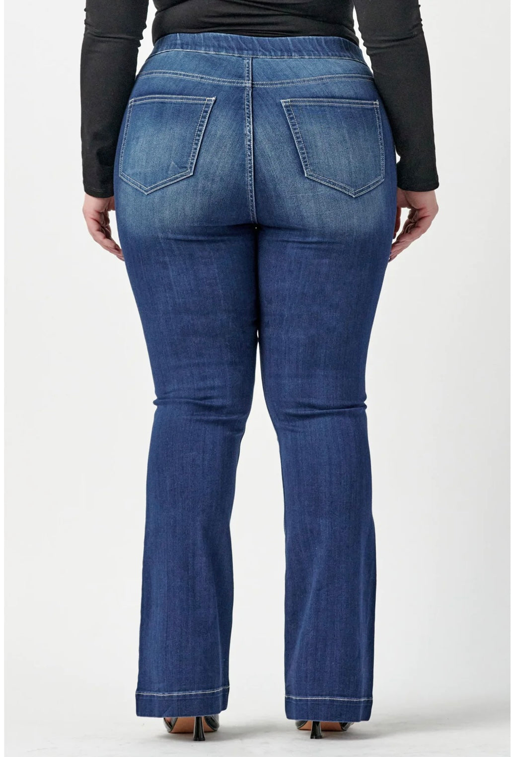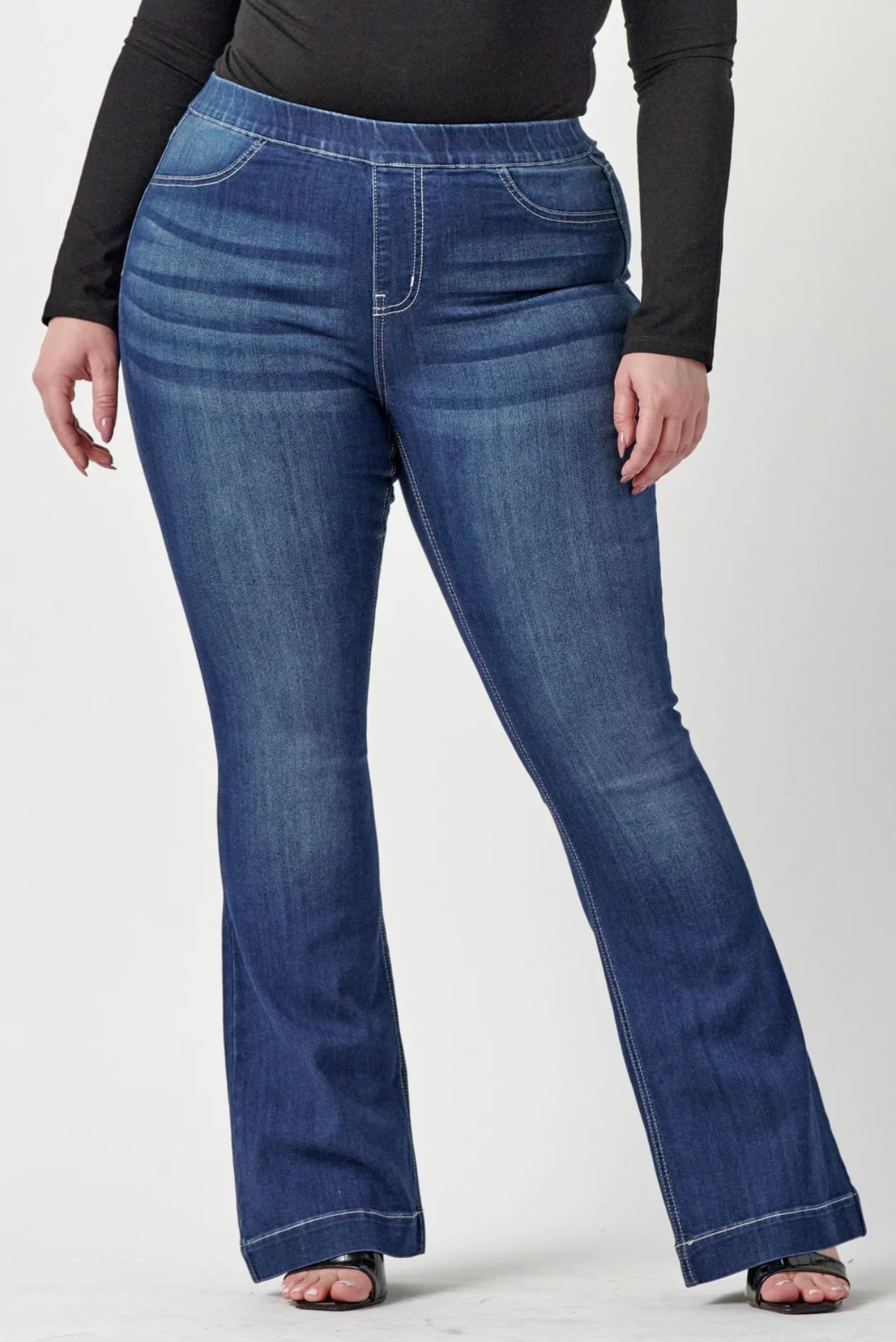 Get Comfortable and trendy in these ultra stretchy jeans in Plus. The dark wash, flared, Jegging features a flattering flared fit, a faded wash, and light whisker detail. Additionally, it has two faux front pockets and two back real pockets.