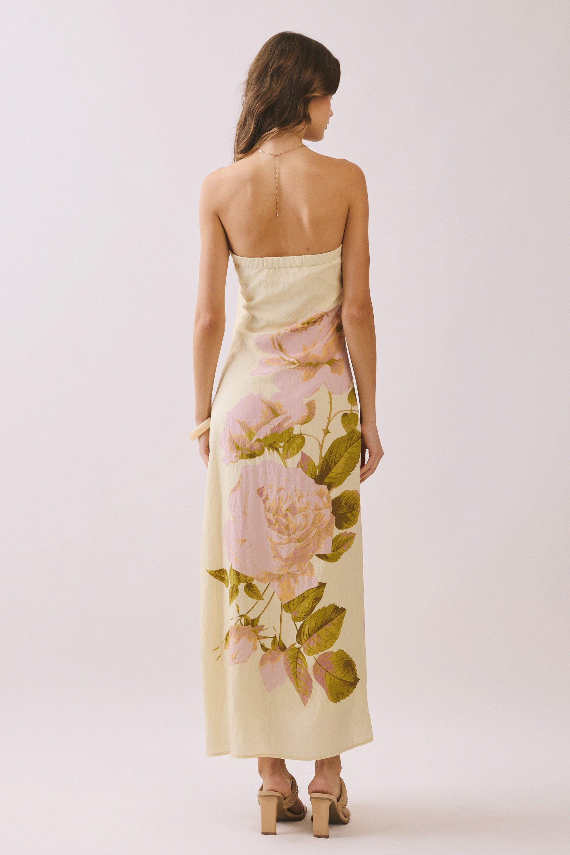 Slip into sunshine with this charming strapless dress that's as soft and dreamy as its butter-yellow hue. Delicate pink roses dance across the fabric, adding a romantic flourish that's perfect for garden parties, date nights, or whenever you want to feel effortlessly elegant.