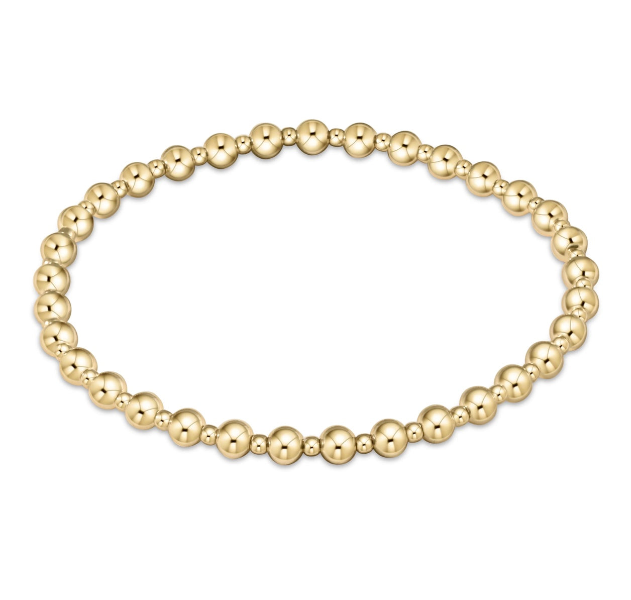 Introducing our new pattern, grateful. This bracelet is a classic gold beaded bracelet with alternating bead sizes. The larger bead size is a 4mm and the smaller bead size is a 2mm.