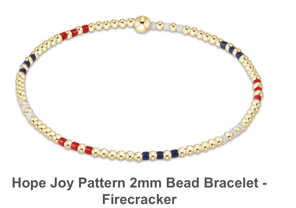 Hope Joy 2mm gold bead bracelet - firecracker with red, white & blue beads. Size 6.75
