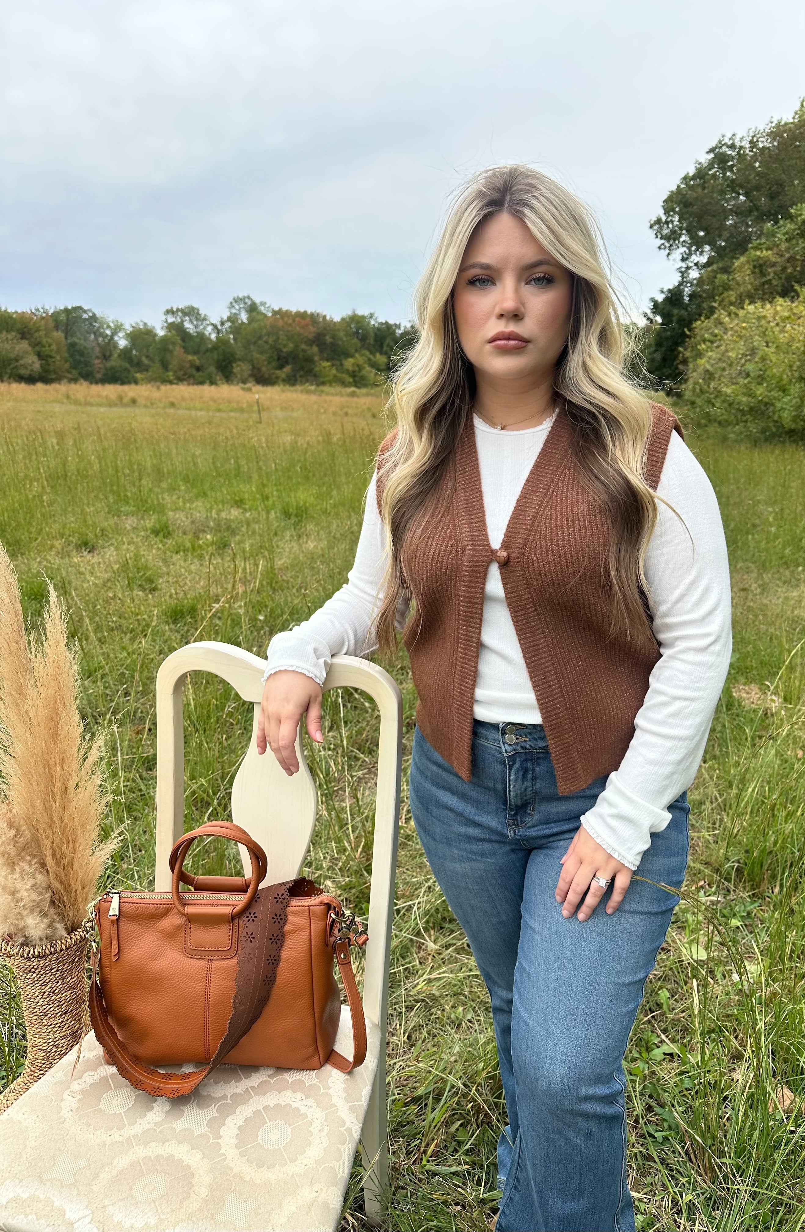Front button brown vest. 53% polyester, 44% acrylic, 3% spandex