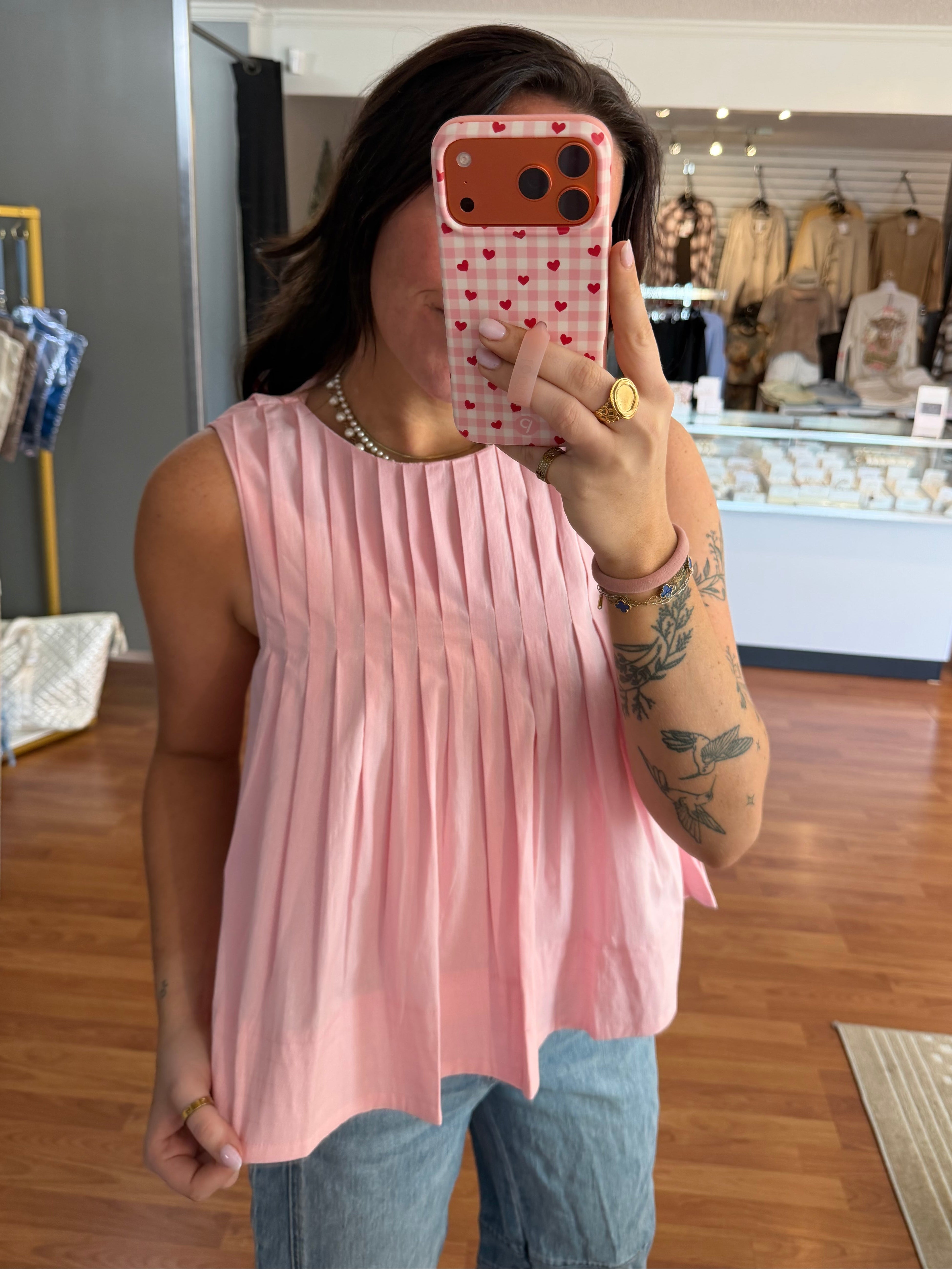 High-low sleeveless top with pleated detailing and a concealed back zipper.