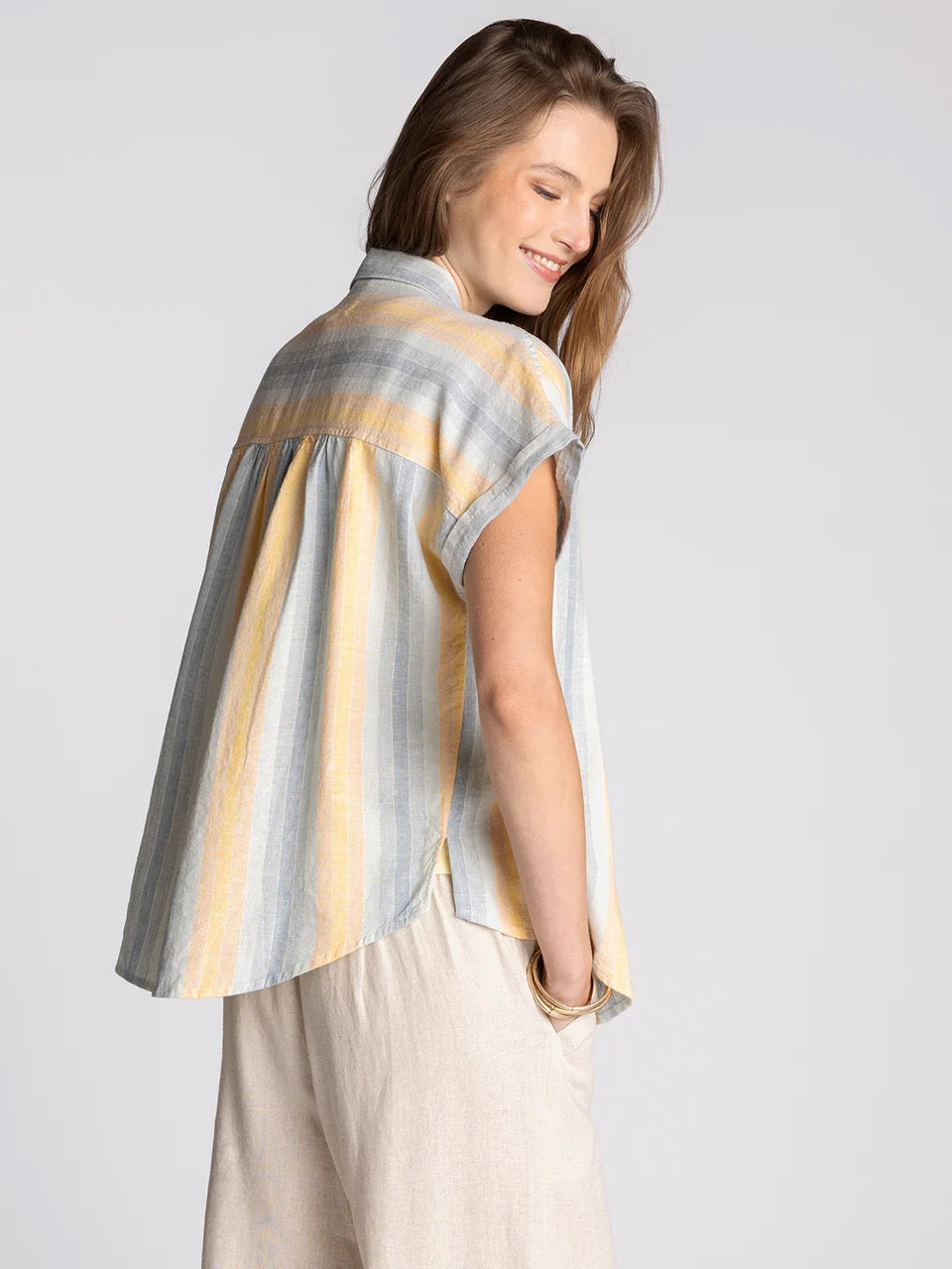 An easy breezy staple, this short sleeve button down is featured in a linen blend stripe fabrication with a shirt tail hem for that effortless vibe.