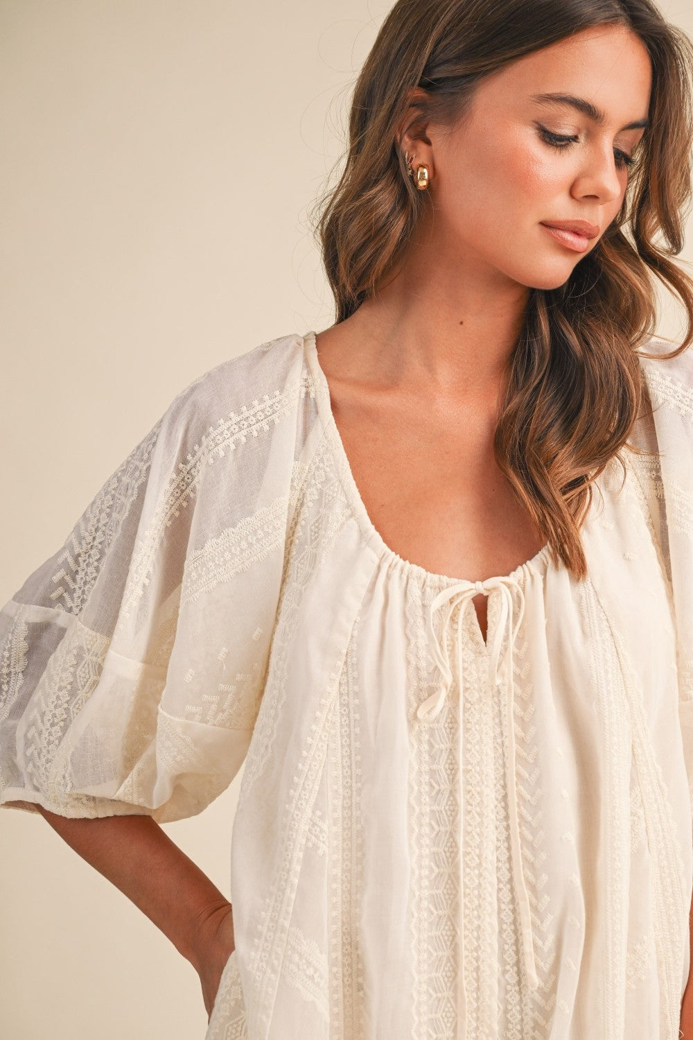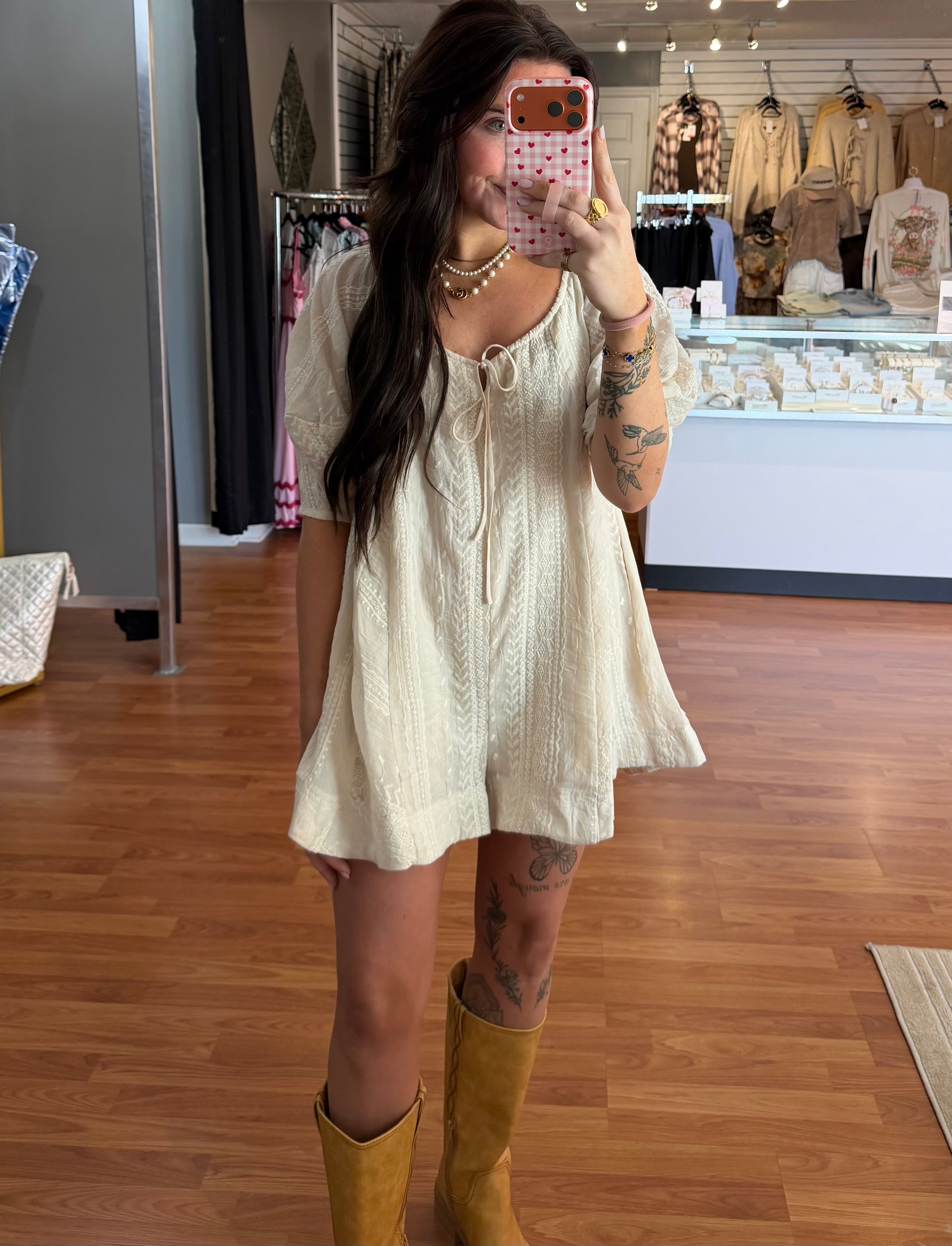 Slip into effortless style with this cream romper that's equal parts cozy and chic. The oversized scoop neckline and dreamy puff sleeves create a romantic silhouette, while delicate embroidery adds a touch of whimsy. Pockets and tie detail at neckline. Perfect for casual outings or dressing up with your favorite accessories. (also available in black)