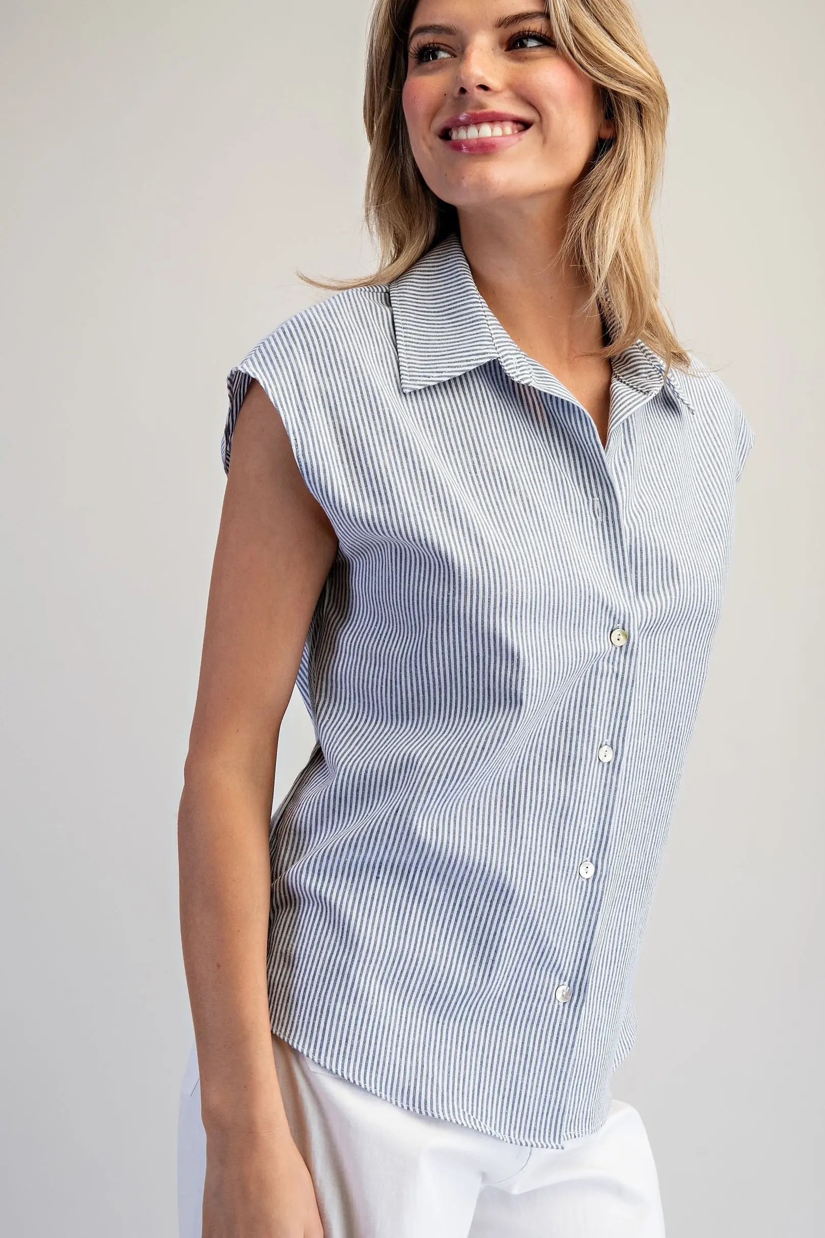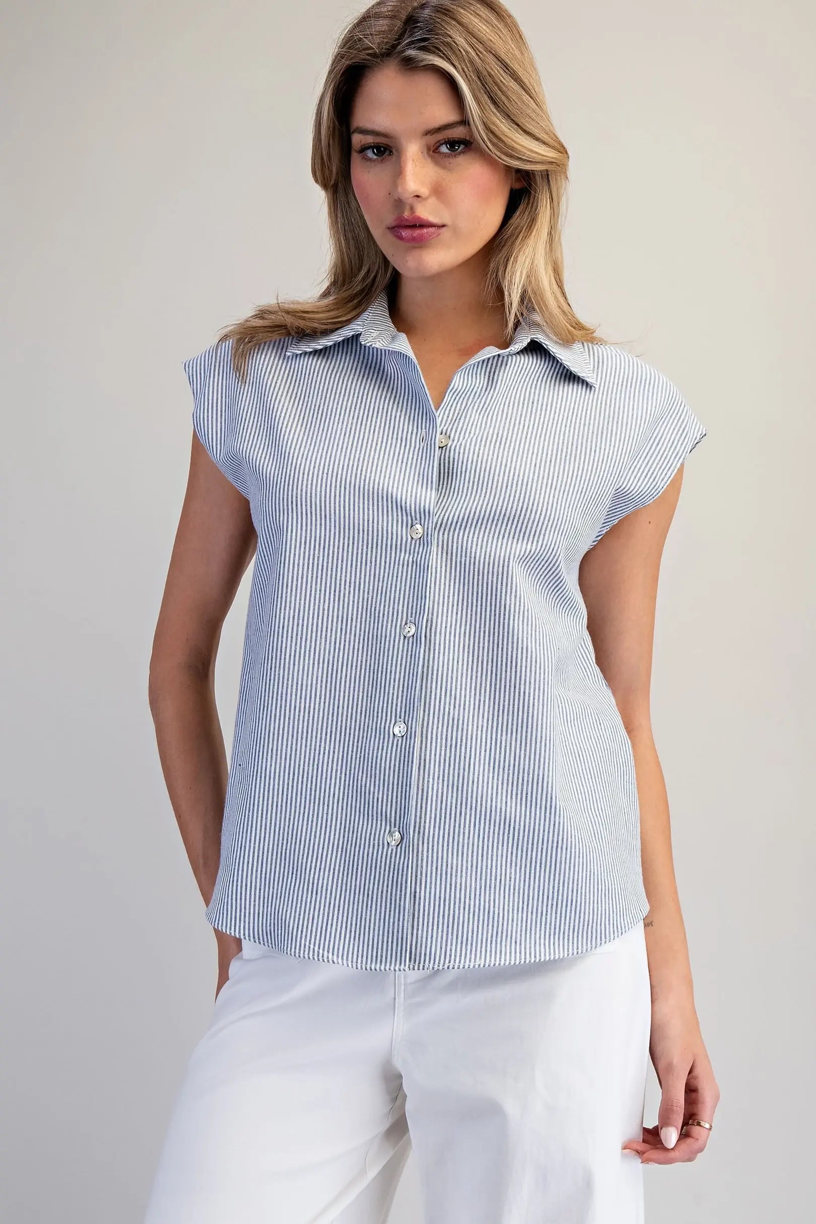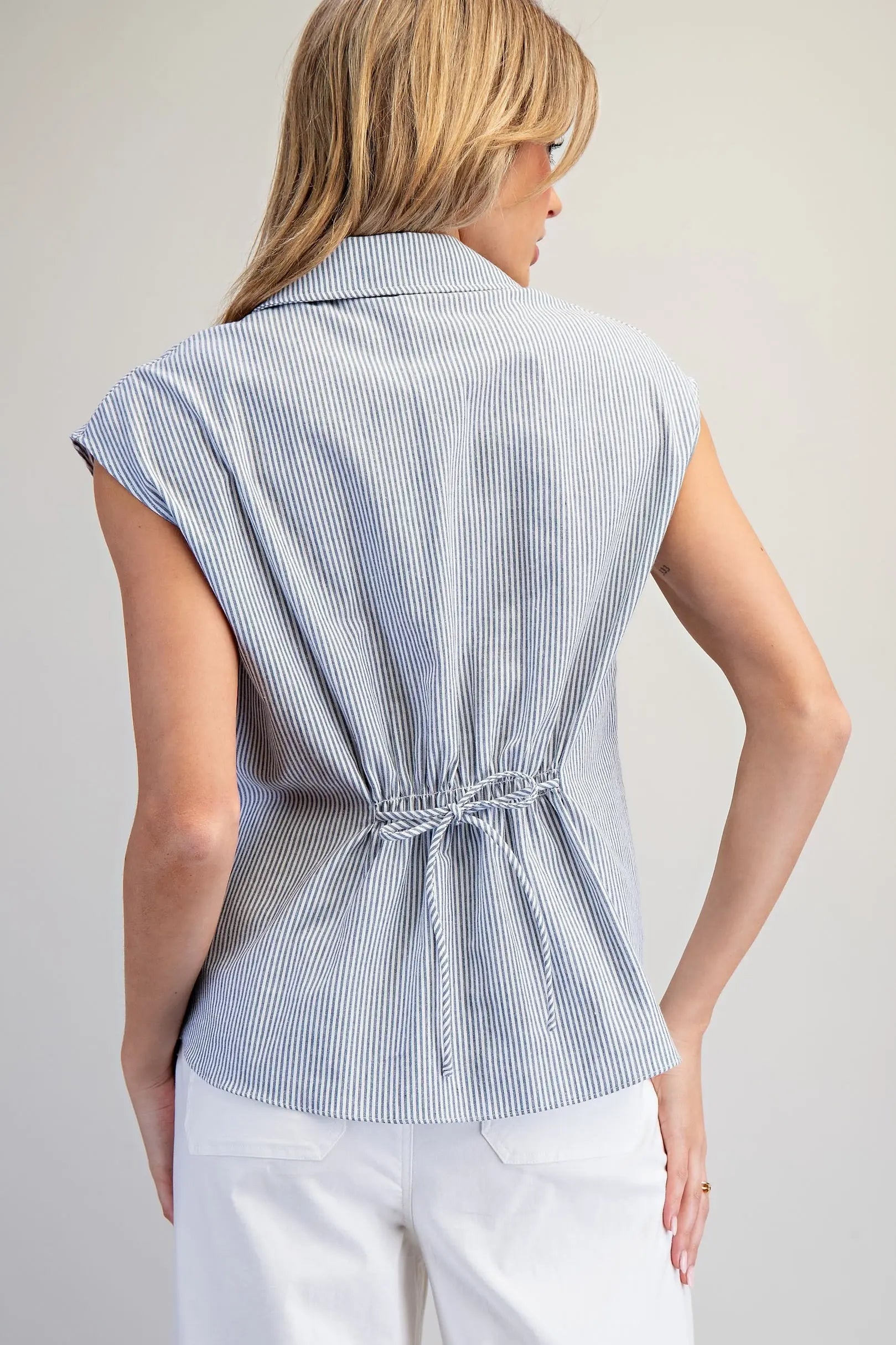 This relaxed fit, button down top features a classic collar and structured cap sleeves, finished with a unique cinched back waist secured by an adjustable drawstring tie for a custom, tailored silhouette. 60% COTTON, 40% POLYESTER
