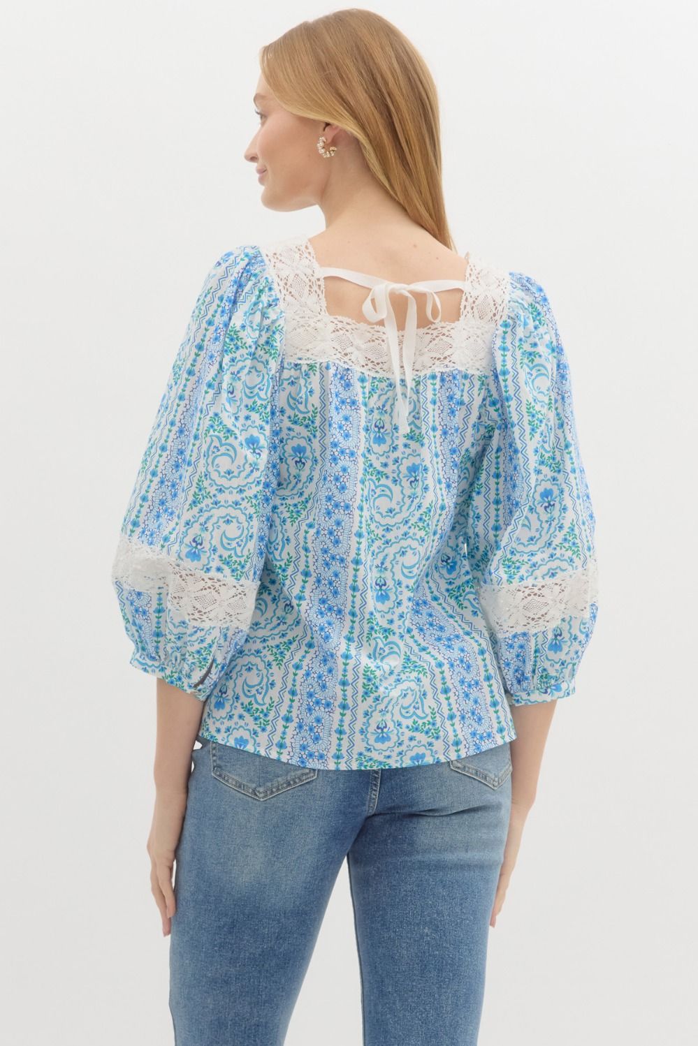 Paisley print square neck ¾ lantern sleeve pullover top featuring lace trim. Self tie at back. Unlined. Woven. Non-sheer. Lightweight.