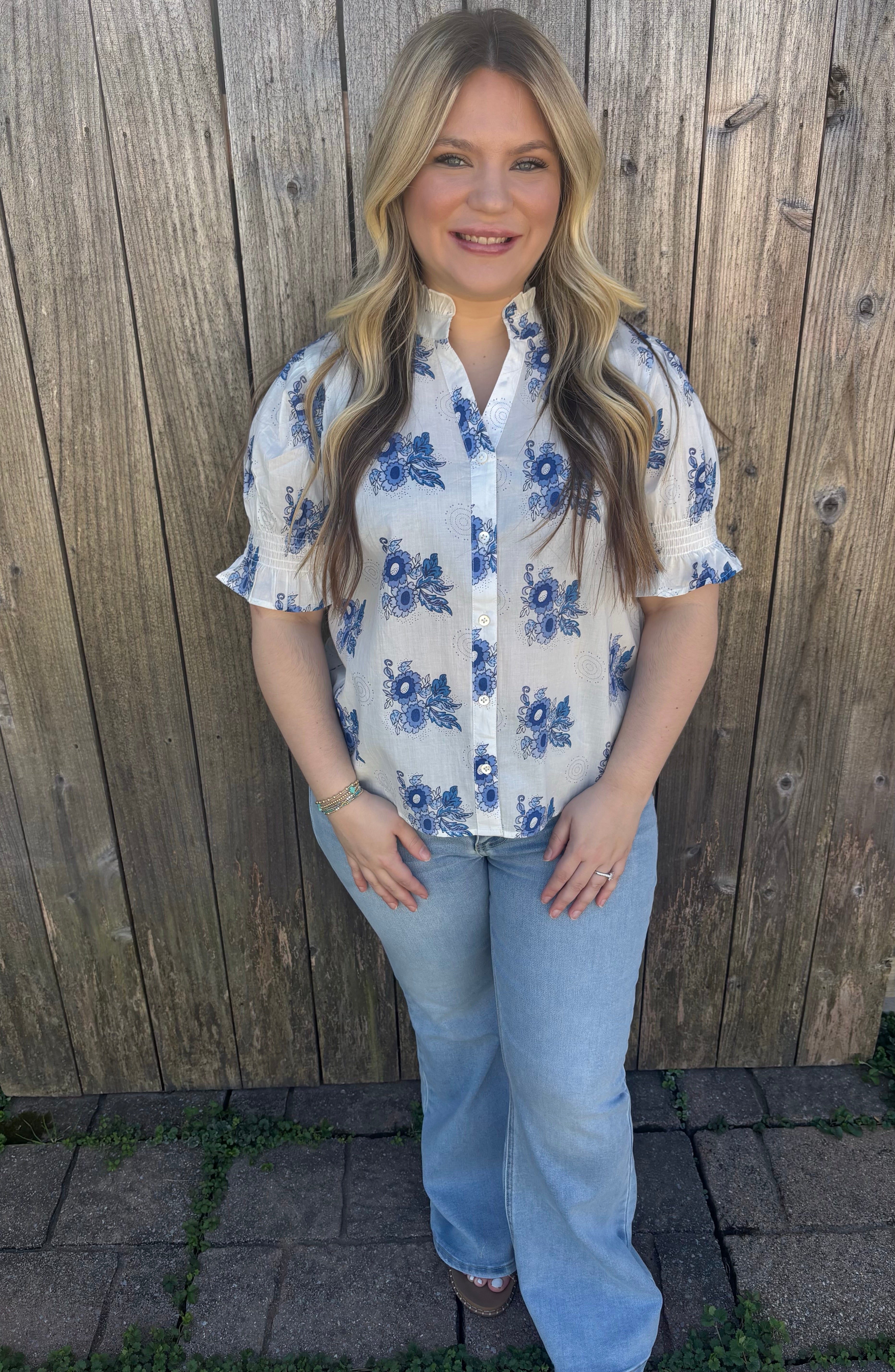 Blue floral print button up top with ruffle detail at neckline and sleeves. 100% cotton