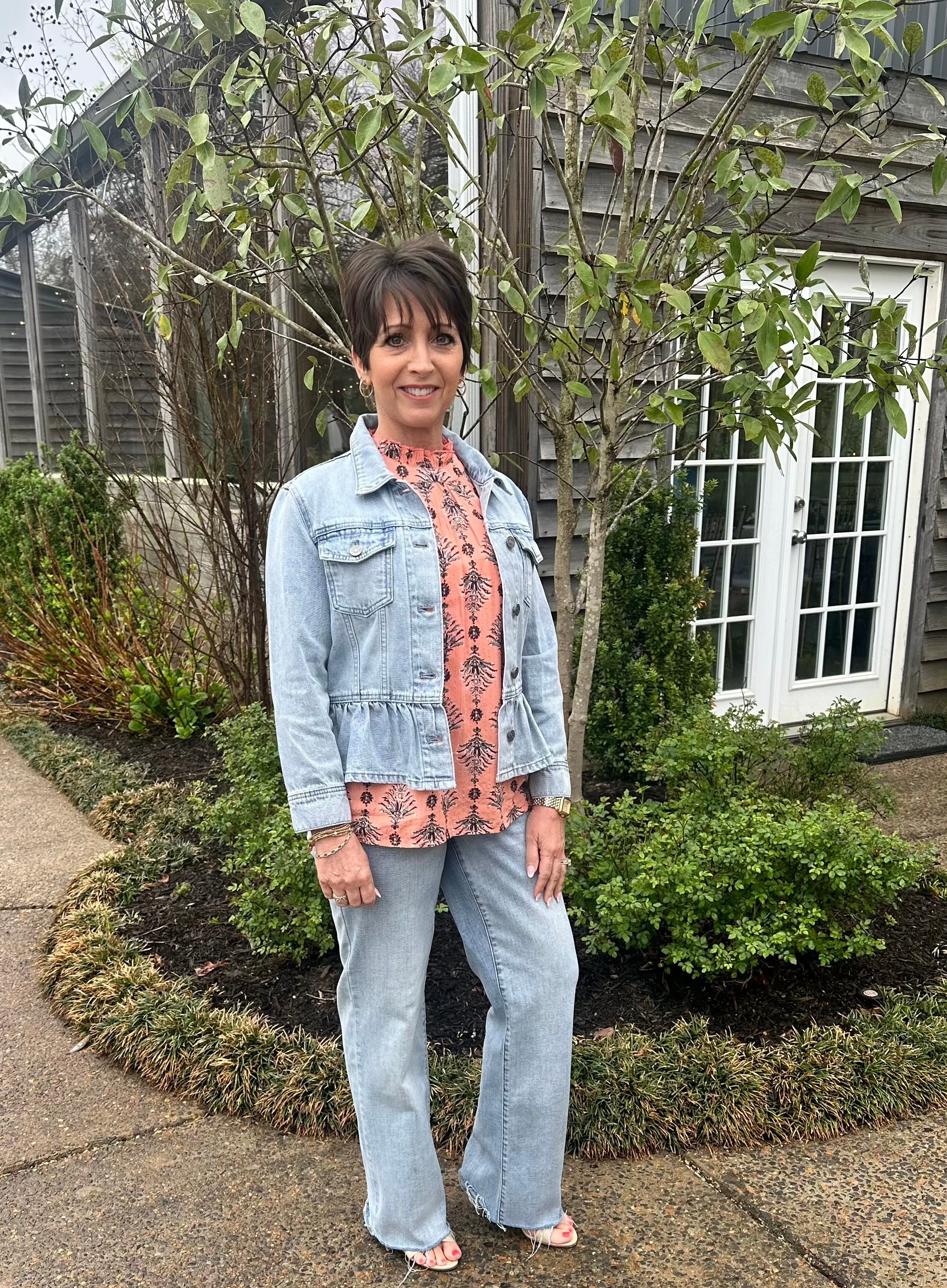 Boho print top with flutter sleeves. 95% cotton, 5% metallic.