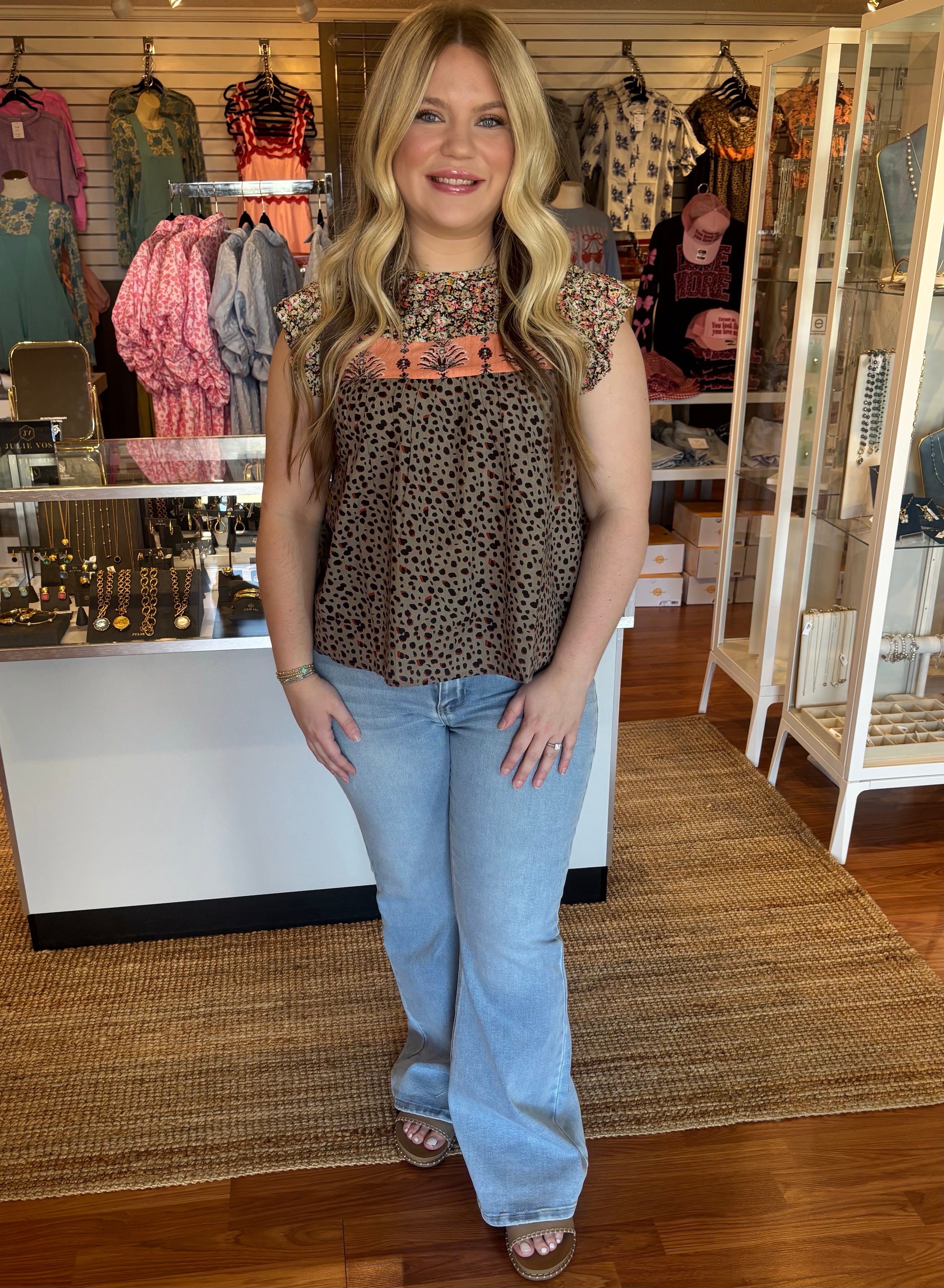 Multi print cheetah top. 80% cotton, 17% viscose, 3% metallic.