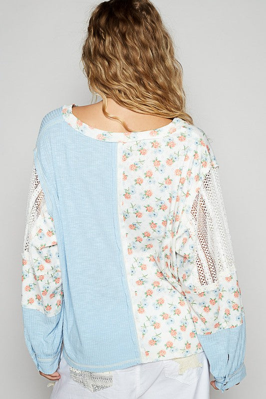 Floral contrast front pocket v neck knit top. Oversized fit.