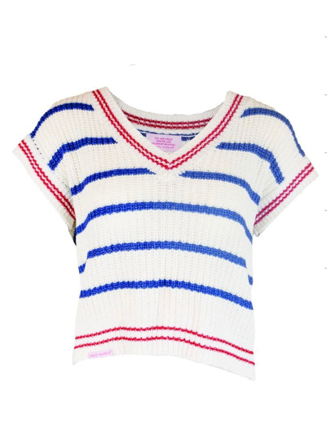 This lightweight sweater is perfect for a casual day out and about. Wear on its own or over a swimsuit for a breezy cover up option it features a v neck with stripe detailing, drop shoulder design and Simply Southern hem label. Made of 42% nylon 58% acrylic. Colors: red & blue stripe.