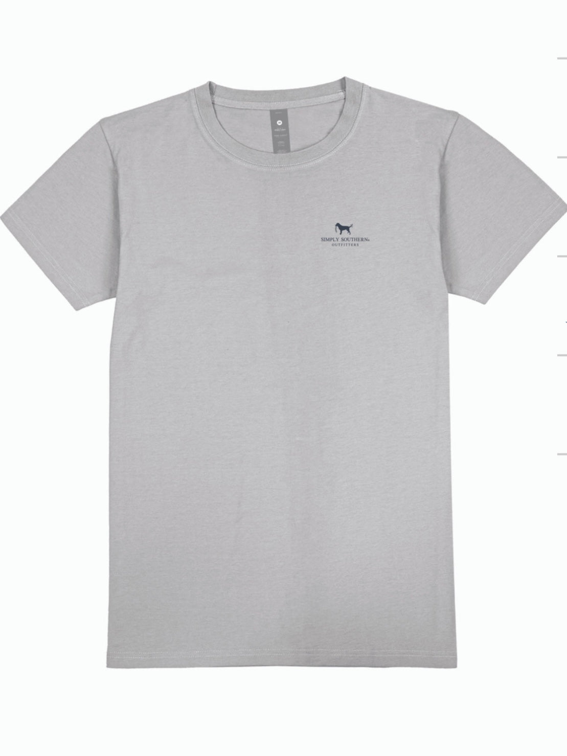Fog grey short sleeve shirt with the phrase ' Just a good ol' 'merican dude' There is a flamingo with a USA flag hat holding a can of beer. Simply Southern logo below and on left chest. 100% cotton. Unisex sizing.