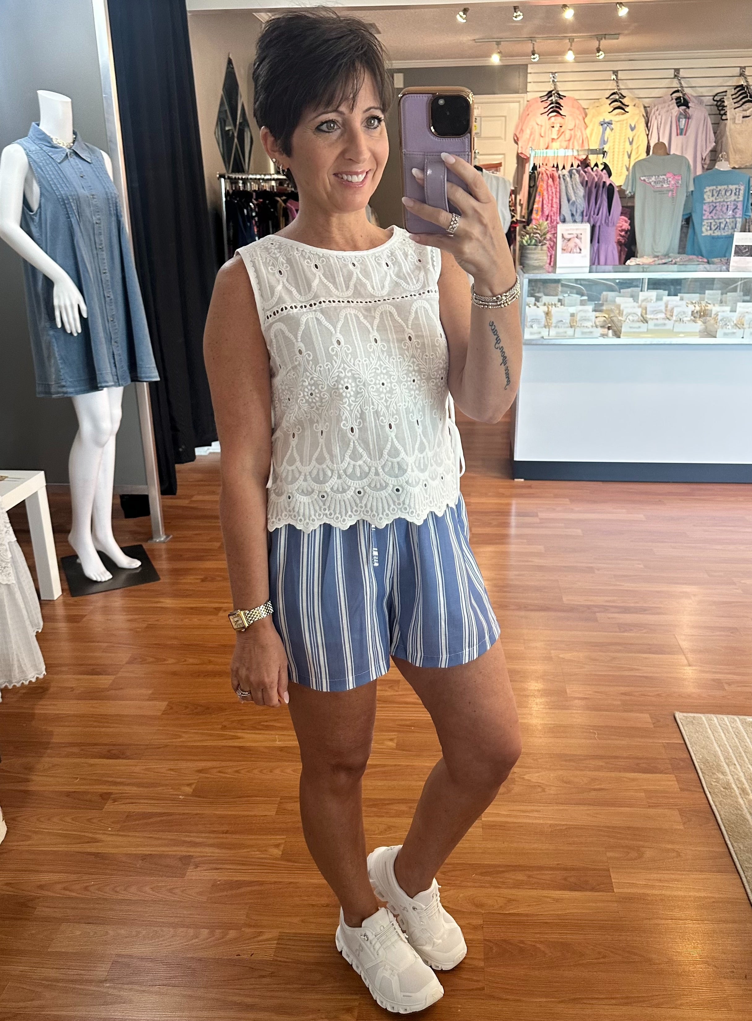 White and blue stripe shorts featuring drawstring at waist and pockets. 100% polyester