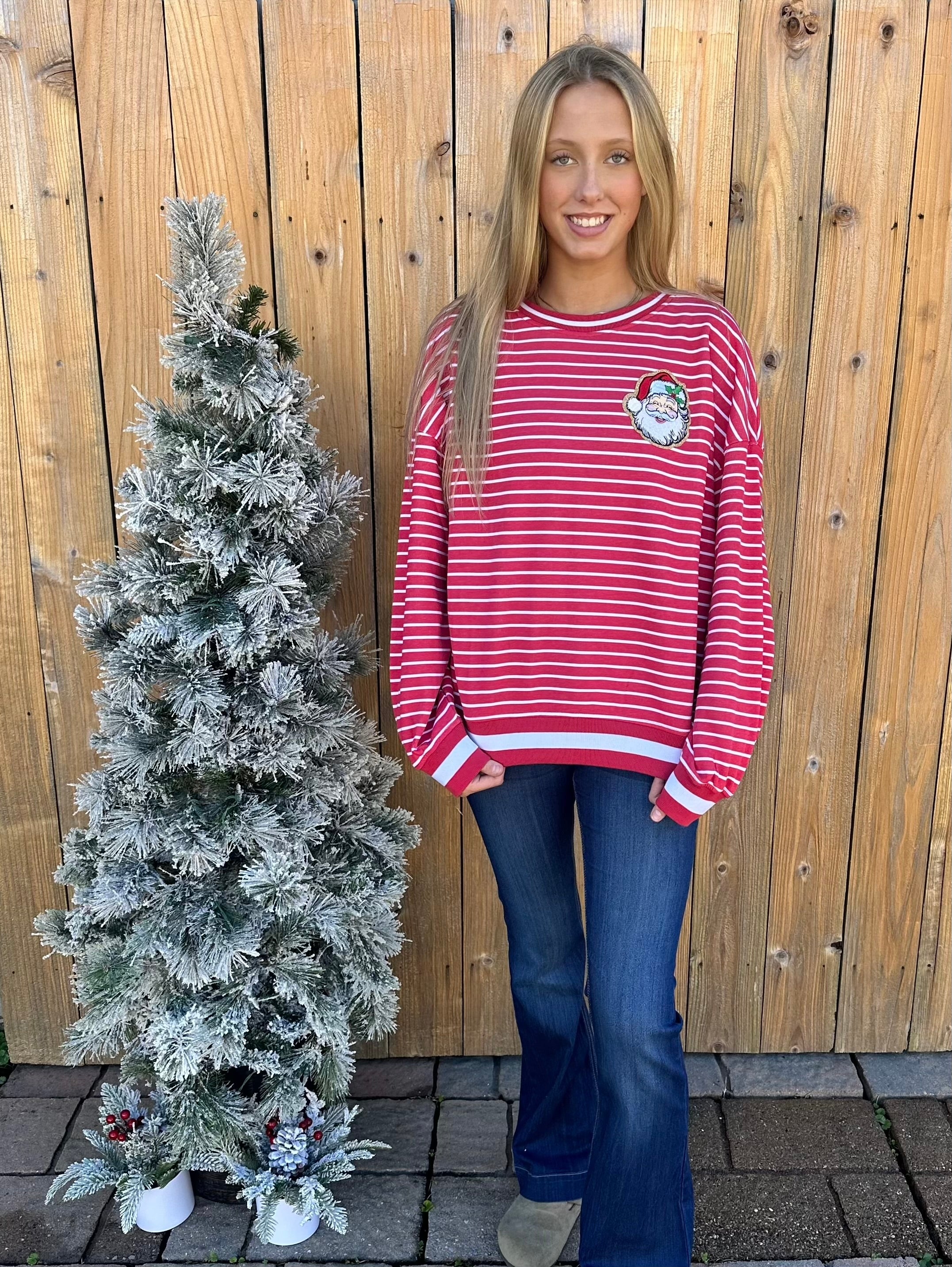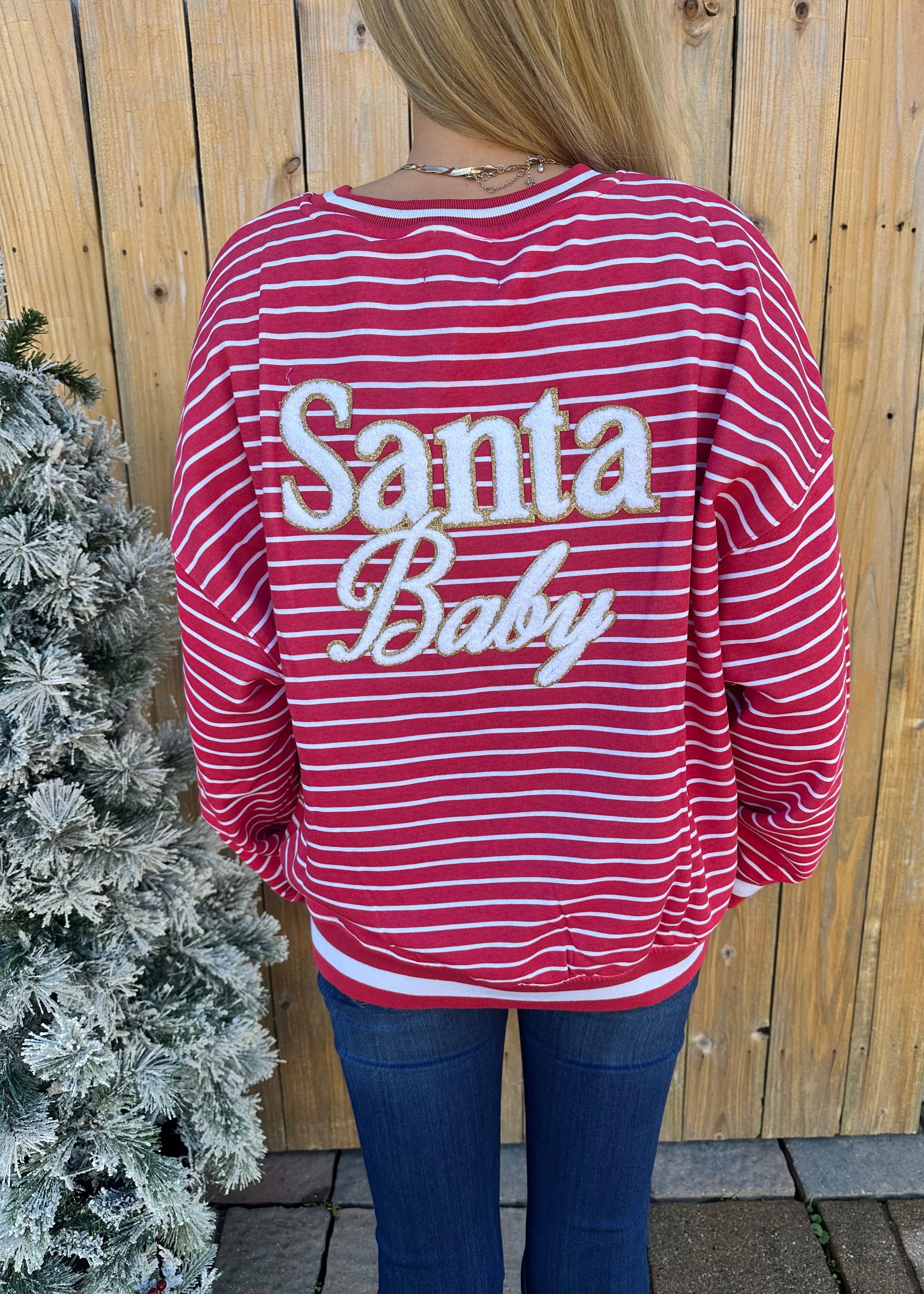 Red and white stripe crew neck, fleece lined, slighty oversized, ribbed hem, neckline, and cuffs with varsity stripe detailing. Embroidered Santa on the front, with cursive "Santa Baby" detailing on the back.
